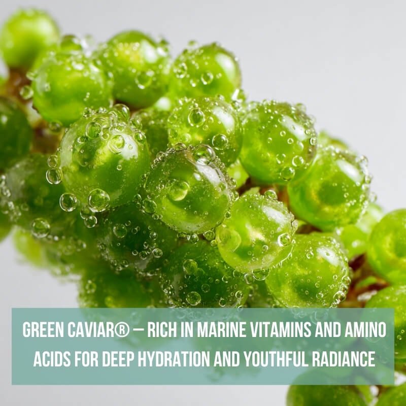 Green Caviar®: The ocean’s elixir of youth! Brimming with amino acids, vitamins, and minerals, this marine treasure delivers deep hydration, enhances elasticity, and revives your skin’s natural luminosity for a smooth, radiant glow.